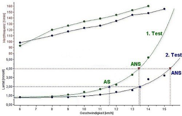 Dabei wird der oben erklärte Drift für die Beurteilung der anaeroben Kapazität genutzt. Eine gute anaerobe Kapazität ist vor allem für längere Ausdauerrennen ein sehr wichtiger Schlüssel zum Erfolg. Wer bereits einmal einen Laktatstufentest im Labor gemacht hat, kennt seine anaerobe Schwelle (ANS). Es gibt aber auch eine weniger bekannte aerobe Schwelle (AS). Grundsätzlich lässt sich sagen, dass, bei einer Verschiebung von AS nach rechts, die Grundlagenausdauer verbessert wurde (siehe Bild).